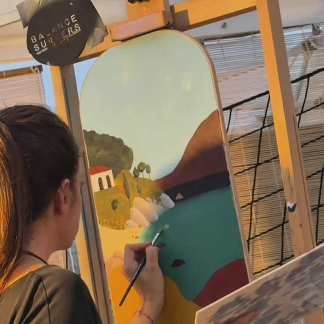 Esta tabla no es solo un objeto decorativo, es el registro de un momento de concentración absoluta. La artista Mena Marcona (@menamarcona) creó este paisaje mediterráneo mientras ella misma se encontraba en equilibrio sobre otra Balance Surfers.